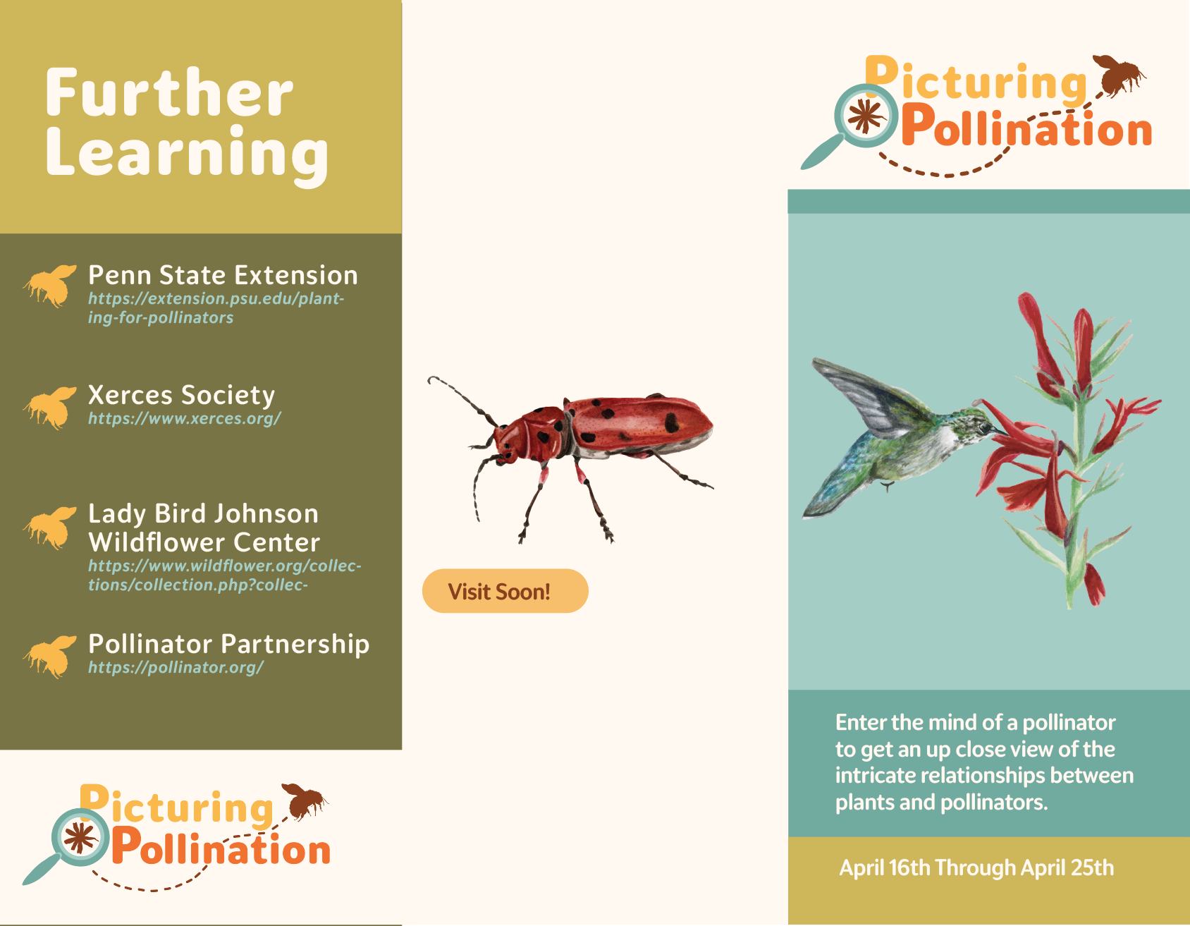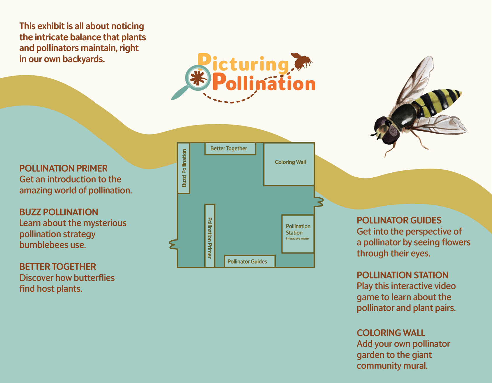 This exhibit graphic explores the range of specialization between plants and pollinators. It also describes the techniques plants use to entice pollinators. This graphic will accompany a self guided video game that engages guests to match plants with their ideal pollinator.